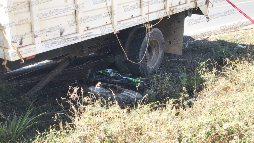 Tras el brutal impacto, el conductor de la frágil unidad salió proyectado contra la barrera de contención, mientras que la motocicleta completamente destrozada quedando bajo las llantas traseras de la pesada unidad, arrastrándola por varios metros.