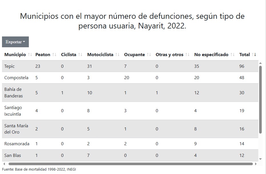 Nayarit (1,238,893 habitantes): 278 homicidios, 122 por tránsito (43.8 por ciento).