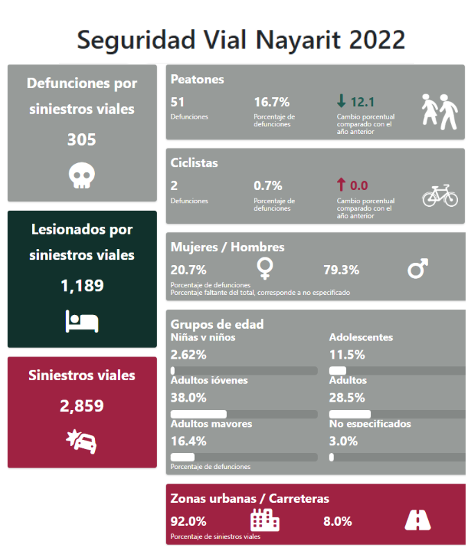 Este aumento en el número de vehículos trae consecuencias directas en la seguridad vial. De acuerdo con el Secretariado Técnico del Consejo Nacional para la Prevención de Accidentes (STCONAPRA), en 2022 Nayarit registraba una tasa de motorización de 424.4 vehículos por cada mil habitantes. Ese mismo año, la tasa de accidentabilidad fue de 5.3 por cada mil vehículos, la de mortalidad de 23.9 por cada 100 mil habitantes y la de letalidad de 10.7 por cada 100 accidentes. Aunque los datos corresponden a hace tres años, todo indica que hoy las cifras son más altas, tanto a nivel estatal como nacional.
