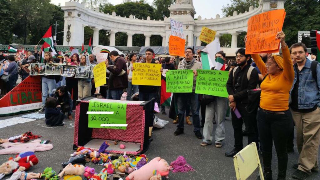 Mientras los tripulantes clamaban por ayuda, en el corazón del país se organizaron manifestaciones para exigir la liberación y protección consular de los connacionales. Con pancartas y banderas palestinas, reclamaban la intervención del gobierno mexicano.
