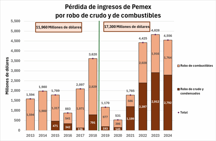 En términos financieros ―concluía la mencionada colaboración, citando el estudio del ex rector de la UNAM― “El robo de combustibles o huachicol tradicional implicó una pérdida total de ingresos de 7,800 millones de dólares, 3,600 millones de dólares durante el sexenio de Peña Nieto y 4,200 millones de dólares durante el sexenio de López Obrador”.