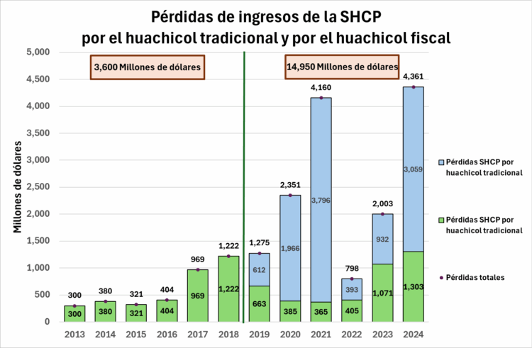 En cuanto al volumen del contrabando de diesel, que “el volumen del huachicol fiscal de diesel durante el sexenio anterior se estima en 43.7 Millones de barrilles diarios [Mbd] (10% del consumo aparente). En 2021 (año de elecciones) se registró el valor máximo de contrabando de diésel, 88.0 Mbd, volumen que representa el 30% del consumo aparente”, mientras que “el impacto fiscal del contrabando de diésel en estos seis años se puede estimar en 6,700 MM USD, de los cuales, 2,560 MMUSD corresponden a la evasión del IVA y 4,170 MMUSD al pago evitado del IEPS”.