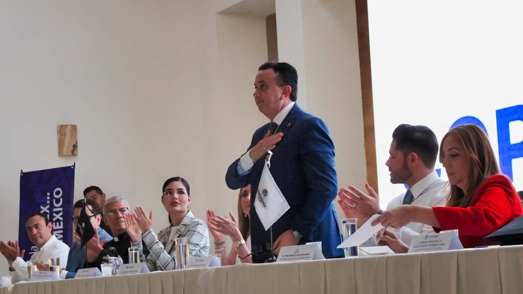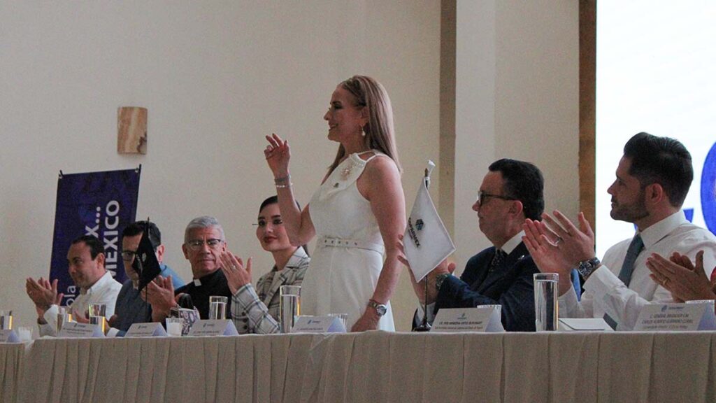 “Seguiremos insistiendo”, dice, y su voz no titubea, “porque estamos convencidos que la colaboración público y privada es la base para generar inversión, empleo y bienestar”. Y entonces, la demanda: “Es el momento que el gobierno confíe y apueste también por los empresarios locales”. Es un reclamo envuelto en seda. Un “aquí estamos, invirtiendo, generando empleo, úsennos”. Llama a los suyos a no ser “espectadores”, sino “protagonistas”. Habla de casi 55 años de Coparmex en el estado, de no limitarse a “producir”, sino a “participar”.