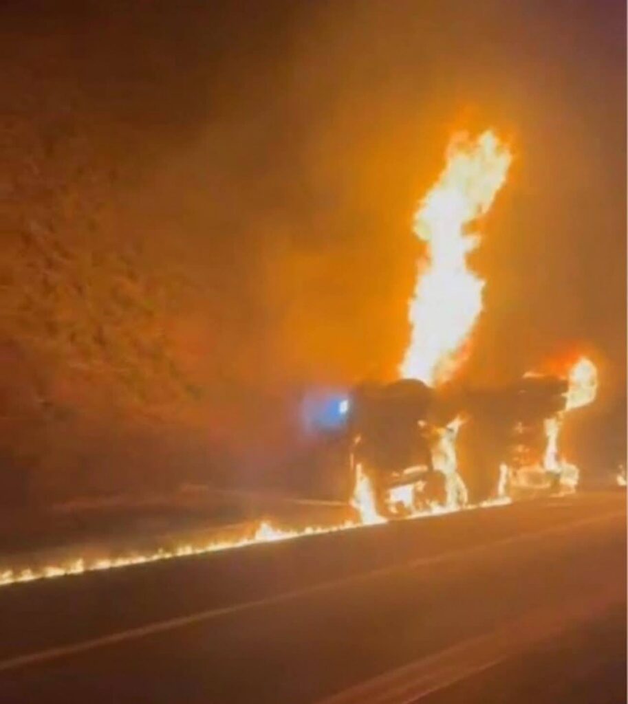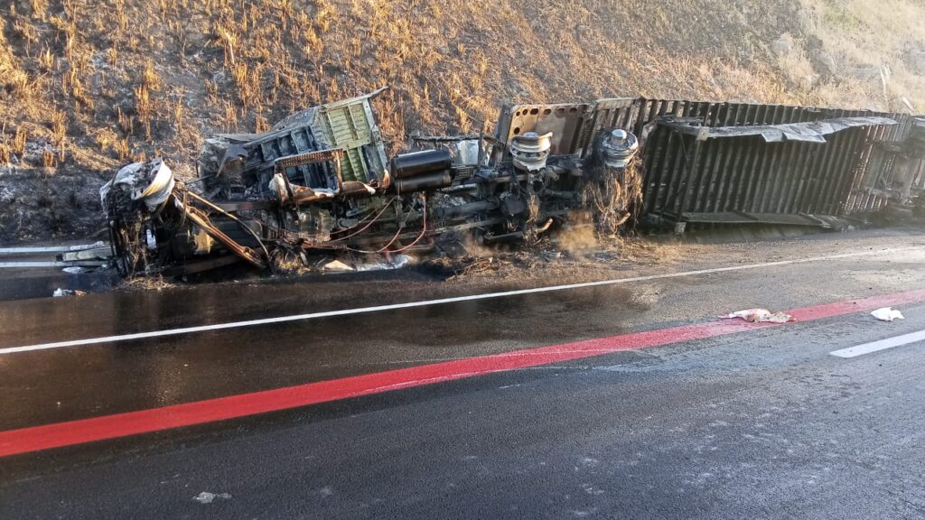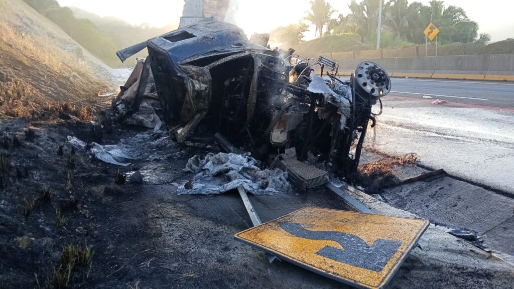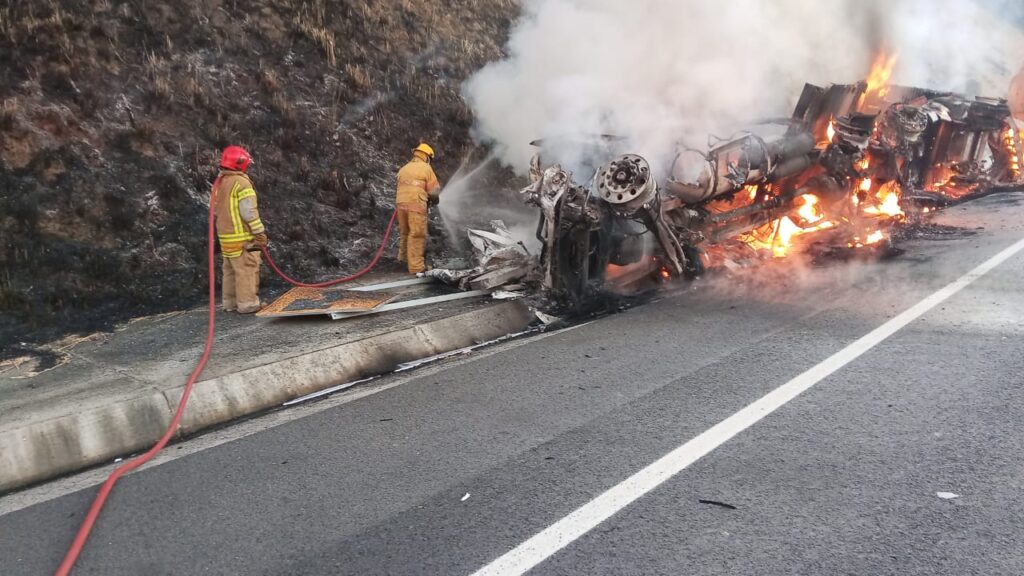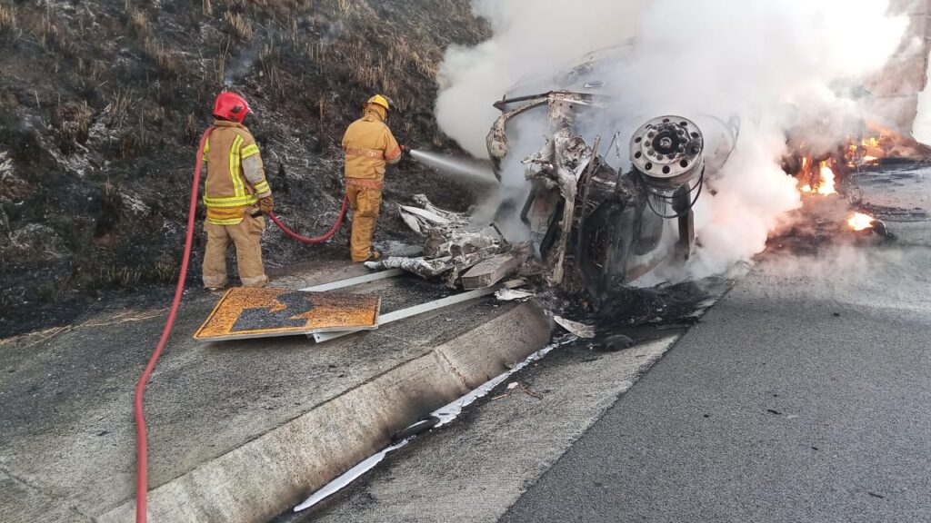 Al llegar al punto, los bomberos estatales confirmaron que la unidad se encontraba volcada sobre uno de sus costados y en total combustión.