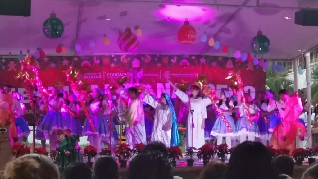 El escenario se llenó de tonalidades claras y tradicionales gorros de Santa Claus que portaban los jóvenes, creando un ambiente festivo que contagió a los asistentes de sonrisas, aplausos y alegría característica de estas fechas.