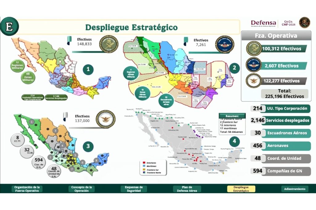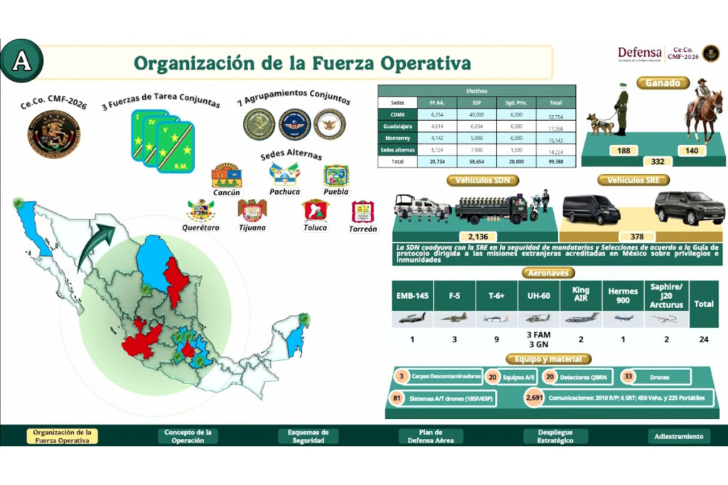 Según explicó, el plan contempla la creación de tres Fuerzas de Tarea Conjuntas —una por cada sede principal: Ciudad de México, Guadalajara y Monterrey—, además de siete agrupamientos conjuntos en sedes alternas y tres agrupamientos de defensa aérea. En total, participarán más de 99 mil efectivos, entre Fuerzas Armadas, Guardia Nacional, elementos de seguridad pública y personal de seguridad privada.