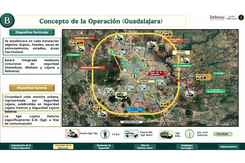 Villalvazo detalló que el esquema de seguridad se sustentará en “cinturones de seguridad” por instalación objetivo —estadios, aeropuertos, hoteles, zonas de entrenamiento y áreas de fan fest—. Cada sitio contará con dispositivos de seguridad inmediata, mediata, lejana y, en algunos casos, un cuarto cinturón de refuerzo.