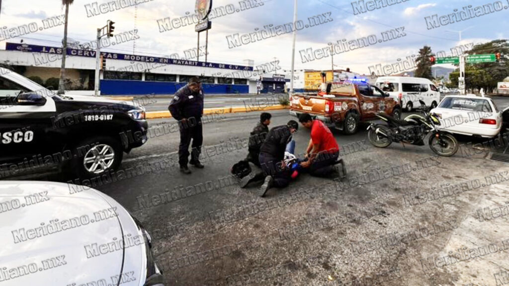 Una joven que conducía una motocicleta resultó lesionada tras ser impactada por un taxi en el cruce del bulevar Tepic-Xalisco y la calle Álamo, justo frente a una reconocida empresa cervecera en la ciudad de Xalisco.