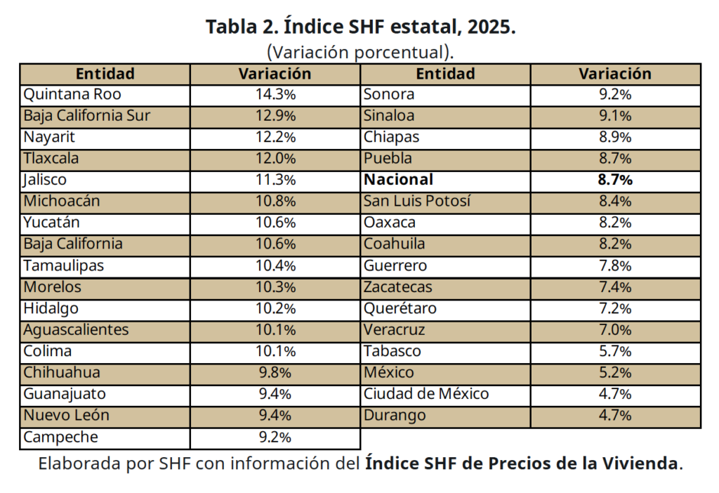 En este nuevo mapa inmobiliario, los estados que encabezan el encarecimiento comparten una característica: crecimiento acelerado y atractivo turístico. Quintana Roo lidera con 14.3 por ciento, seguido de Baja California Sur con 12.9 por ciento, y luego Nayarit con 12.2 por ciento, acompañado por Tlaxcala y Jalisco.