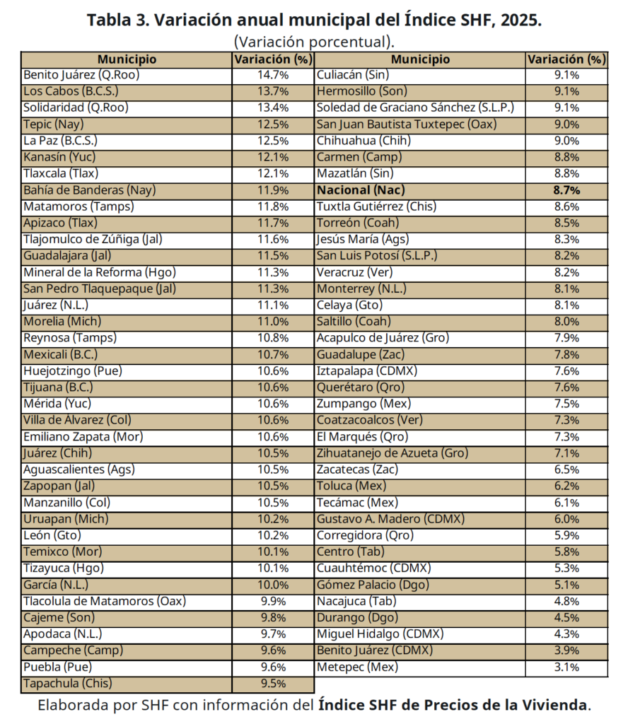 Los municipios más caros cuentan una historia similar. Destinos como Benito Juárez, Los Cabos y Solidaridad encabezan la lista, pero la aparición de Tepic en ese grupo revela algo distinto, el fenómeno ya no es exclusivo de playas internacionales, también alcanza a ciudades intermedias que crecen rápido.