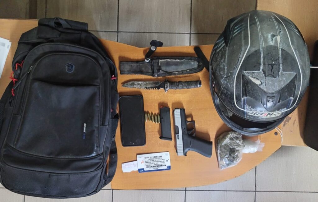 Durante su captura, elementos de la Policía Estatal y personal castrense le aseguraron un arma de fuego marca Glock, un cargador con capacidad para 10 cartuchos abastecido con cinco cartuchos útiles, así como un cuchillo marca Gerber U.S.A. con una longitud de 26.5 centímetros.