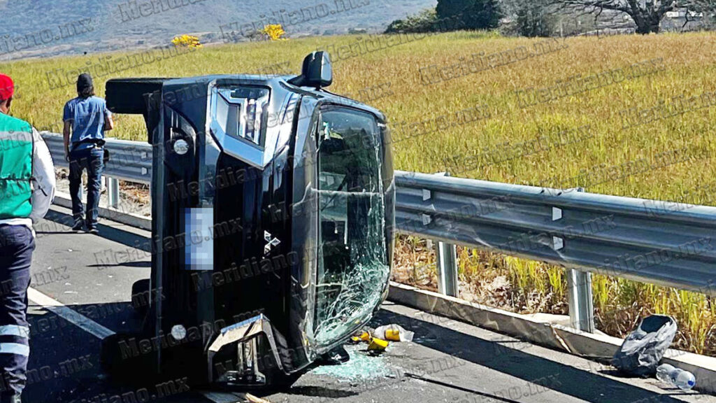 En ese momento, la unidad fue impactada por un vehículo Nissan Versa en el que viajaban un hombre y dos mujeres, lo que provocó que la camioneta terminara volcada sobre la vialidad.