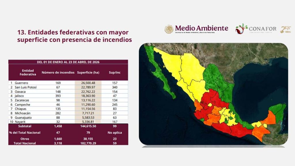 Nayarit atraviesa un momento crítico en materia de incendios forestales, al colocarse entre las entidades más afectadas del país, de acuerdo con el más reciente informe de la Comisión Nacional Forestal (CONAFOR), con corte al 23 de abril de 2026.